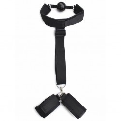 A mordaça com algemas da Fetish Toys combina uma ball gag de silicone hipoalergénico com 4,5 cm de diâmetro e algemas ajustáveis em material de alta qualidade, ligadas por uma corrente de aço inoxidável.