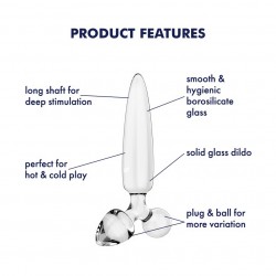 Este dildo de vidro Satisfyer está aqui para lhe proporcionar um prazer triplo! Com um dildo cónico de 21 cm/8,3 pol. de comprimento e dois plugues menores com formatos diferentes, pode escolher: use-o para estimulação anal ou vaginal, estimule apenas as partes externas dos seus pontos sensíveis ou vá mais fundo, conforme desejar – graças ao seu formato especial, é seguro para todos os tipos de prazer.