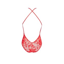 Sedutor body em tule macio com motivos florais. O vermelho intenso e os seios e a barriga expostos chamam a atenção. Decote decorado com uma aplicação prateada. Body com fecho de colchetes na virilha.