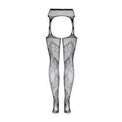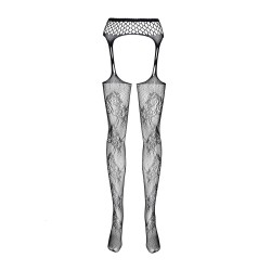 Meias de rede pretas combinadas com um cinto. Têm um padrão floral à frente e atrás e "cristais" de vários tamanhos espalhados por todo o corpo.